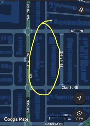The alley bounded by Dix Street NE, 35th Street NE, Clay Street NE, and 34th Place NE. There is proposed work during the week of August 4th and it will take approximately 2 days to complete, weather permitting. The alley will be temporarily closed to through traffic. Work will take place Monday through Friday between the hours of 8:00 am and 5:00 pm. The work will be completed around the trash pickup day.